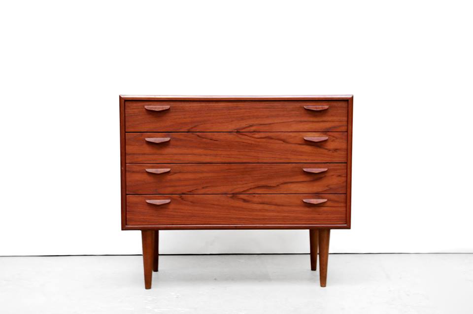 Omschrijving: Prachtige Fins design ladenkast met 4 lades. Uitgevoerd in teak fineer en zeer mooi gevormde plywood houten greepjes. Vooral de houtnerf die doorlopen over de gehele voorkant van de kast, over de laden heen, maakt het kastje een lust voor het oog.