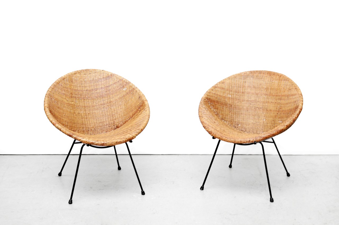 Omschrijving: Twee gevlochten rotan stoelen op zeer mooie minimalistische zwart metalen pootjes. De stoeltjes zijn zeer mooi gemaakt, zelfs de zithoek is verstelbaar door middel van een schroefdraad welke aan de achterkant is aan te draaien. Een van de twee fauteuils heeft op drie plekjes wat rotan verloren, maar dit doet net af aan de stevigheid van de stoel. De stoelen komen uit de Mid Century Modern periode en zijn op internet veelal toegeschreven aan de Amerikaanse ontwerper Paul McCobb. De stoelen zijn 76 cm hoog en hebben een zithoogte van 41 cm.