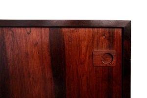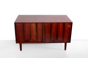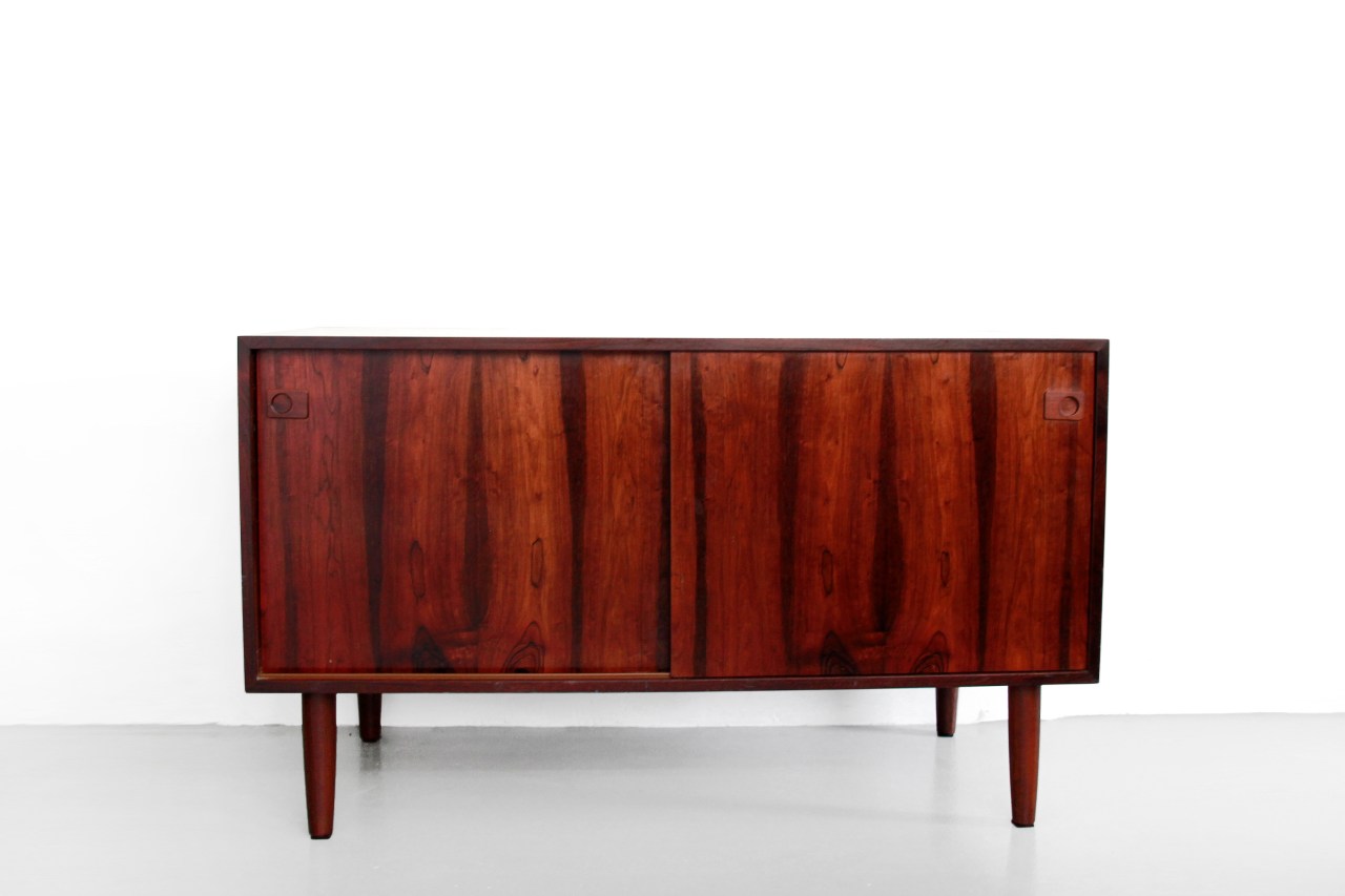 Omschrijving: Prachtige Deens design dressoir met twee schuifdeuren. Uitgevoerd in Rio Palissander fineer en zeer mooi gevormde massief palissander houten greepjes. Dit dressoir is niet al te breed en is dus perfect voor een wat kleiner (Amsterdams) huisje. Je zou erg goed te televisie op deze kast kwijt kunnen. Door het palissander is deze kast donker van kleur met een prachtige dramatische tekening in het hout.