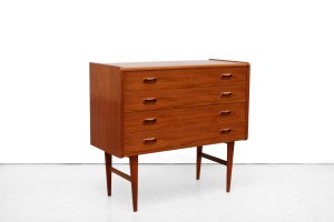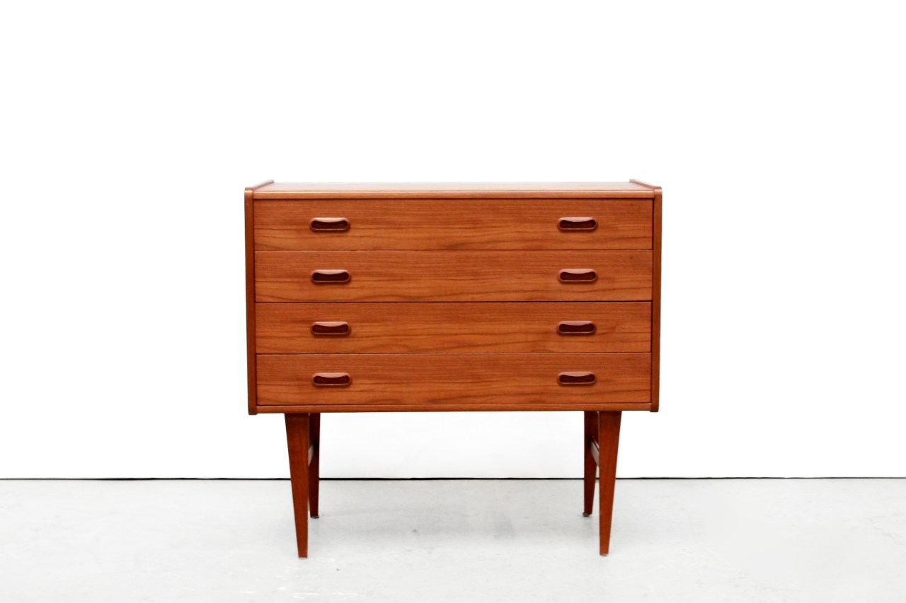 Omschrijving: Prachtige Deens design ladenkast met 4 lades. Uitgevoerd in teak fineer en zeer mooi gevormde teak houten greepjes. Het design van de smalle pootjes zorgen voor een erg mooi en elegant multifunctioneel opbergmeubel.