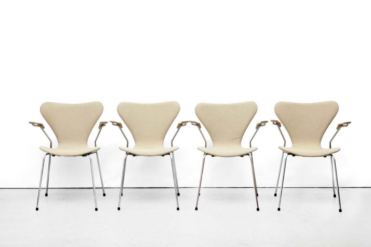 Omschrijving: Prachtige set van de meest bekende stoel van Arne Jacobsen, model 3207, oftewel de vlinderstoel. Het gaat hier om een set van vier gestoffeerde stoelen met armleuningen die zijn uitgebracht in 1979. Het voordeel hiervan is dat de zithoogte wat hoger is dan de oude modellen uit de jaren 50 en 60. De stoelen zijn gemerkt met een Fritz Hansen sticker. Ook zijn de originele kappen aan de onderkant aanwezig. De stoelen zijn 76 cm hoog, 46 cm breed en 44 cm diep.