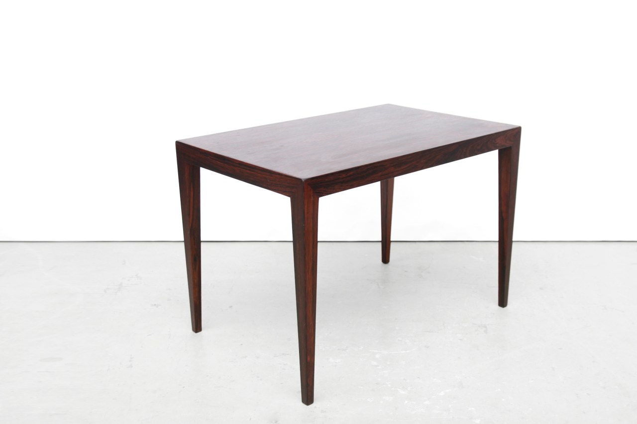 Omschrijving: Erg mooie bijzettafel of kleine salontafel van Severin Hansen voor Haslev Møbelfabrik. De tafel is gemaakt van palissander fineer. Prachtig iconisch design van Severin Hansen. Vooral de kenmerkende verbinding van de pootjes aan het blad zijn uitzonderlijk. De afmeting is 70 cm breed bij 45 cm diep bij 48cm hoog.