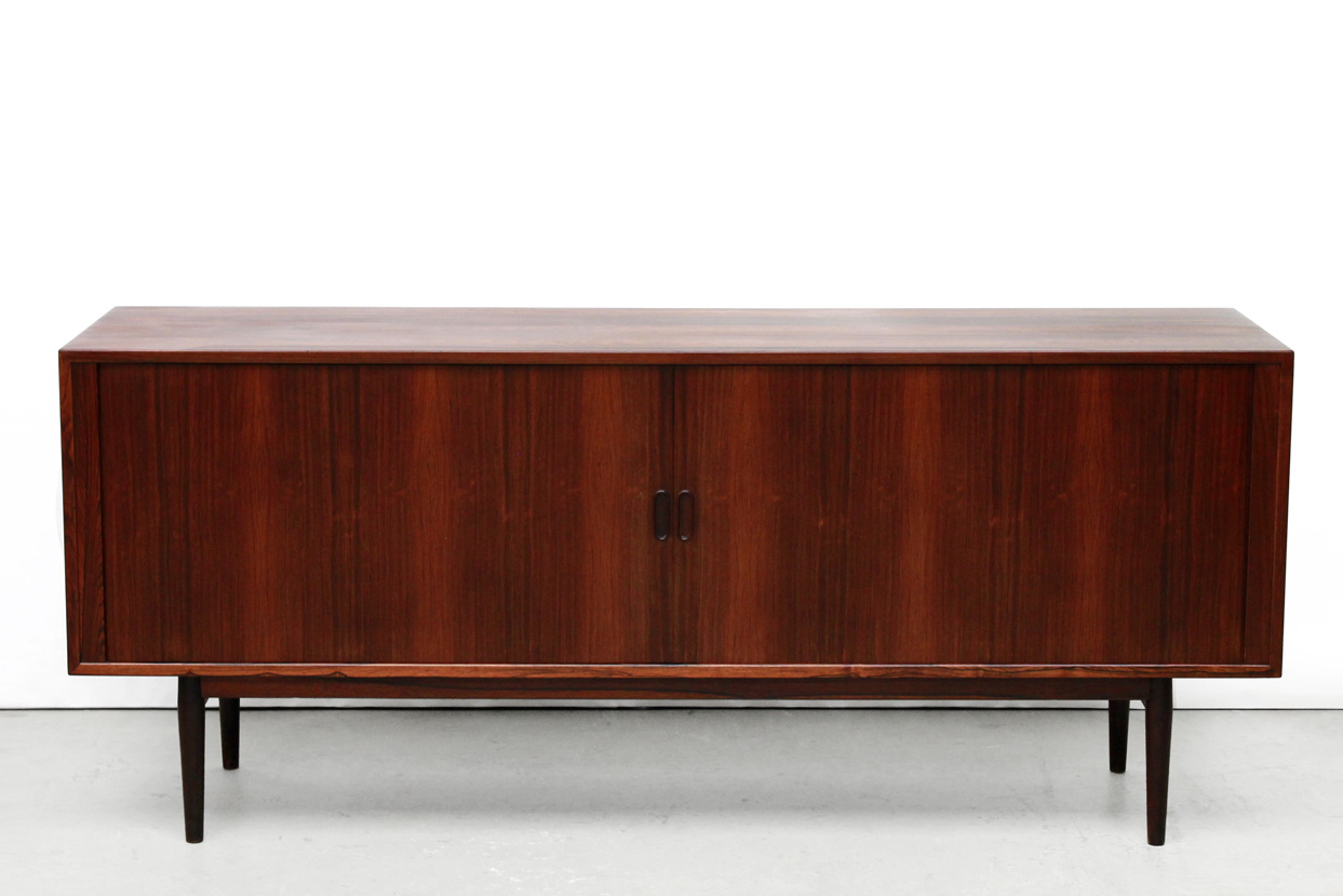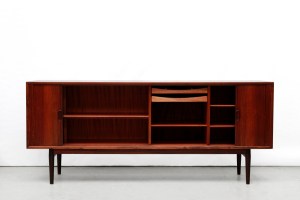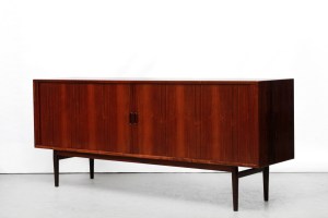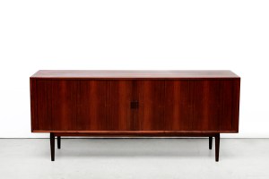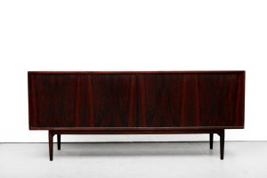 Omschrijving: Erg mooi dressoir ontworpen door Arne Vodder voor Sibast, Denemarken in de jaren 60. Het dressoir is gemaakt van palissander en heeft een zeer mooie tekening in het hout. Het dressoir heeft twee ‘tambour’ schuifdeuren met achter de deuren 4 planken en twee lades. Ook de achterkant is mooi afgewerkt met palissander fineer, het dressoir kan daarom ook zeer goed midden in de ruimte geplaatst worden. In de linkerhoek beneden in de kast is een klein gaatje geboord voor kabels. Het dressoir is 190 cm breed, 47 cm diep en 80 cm hoog.