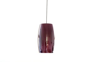 Omschrijving: Prachtige hanglamp ontworpen door Jo Hammerborg bestaande uit twee glazen kelken. Namelijk een paarse en een witte. De witte glazen kelk is iets kleiner en valt in de paarse kelk, wat een prachtig effect geeft zodra de lamp aanstaat. De lamp is 36 cm hoog en heeft een diameter van 20 cm.