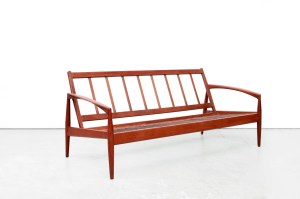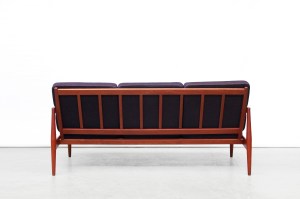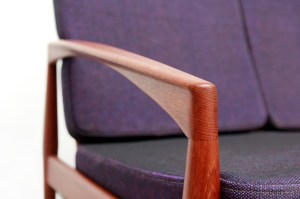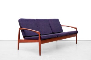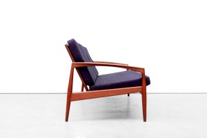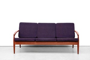 Omschrijving: Prachtige 3-zits bank van Kai Kristiansen, gemaakt door Magnus Olesen in Denemarken. Dit model, ‘Model 121’ ook wel ‘Paper Knife’ genoemd, is gemaakt van massief teak hout en is van zeer hoge kwaliteit. Het teakhouten frame is ontworpen met prachtige slanke lijnen en uitstekende details. Kijk bijvoorbeeld eens naar de armleuningen. Dit is echt vakmanschap. De kussens van deze sofa heeft nog de originele paarse stof, welke grondig zijn schoongemaakt, en is voorzien van nieuw foam.