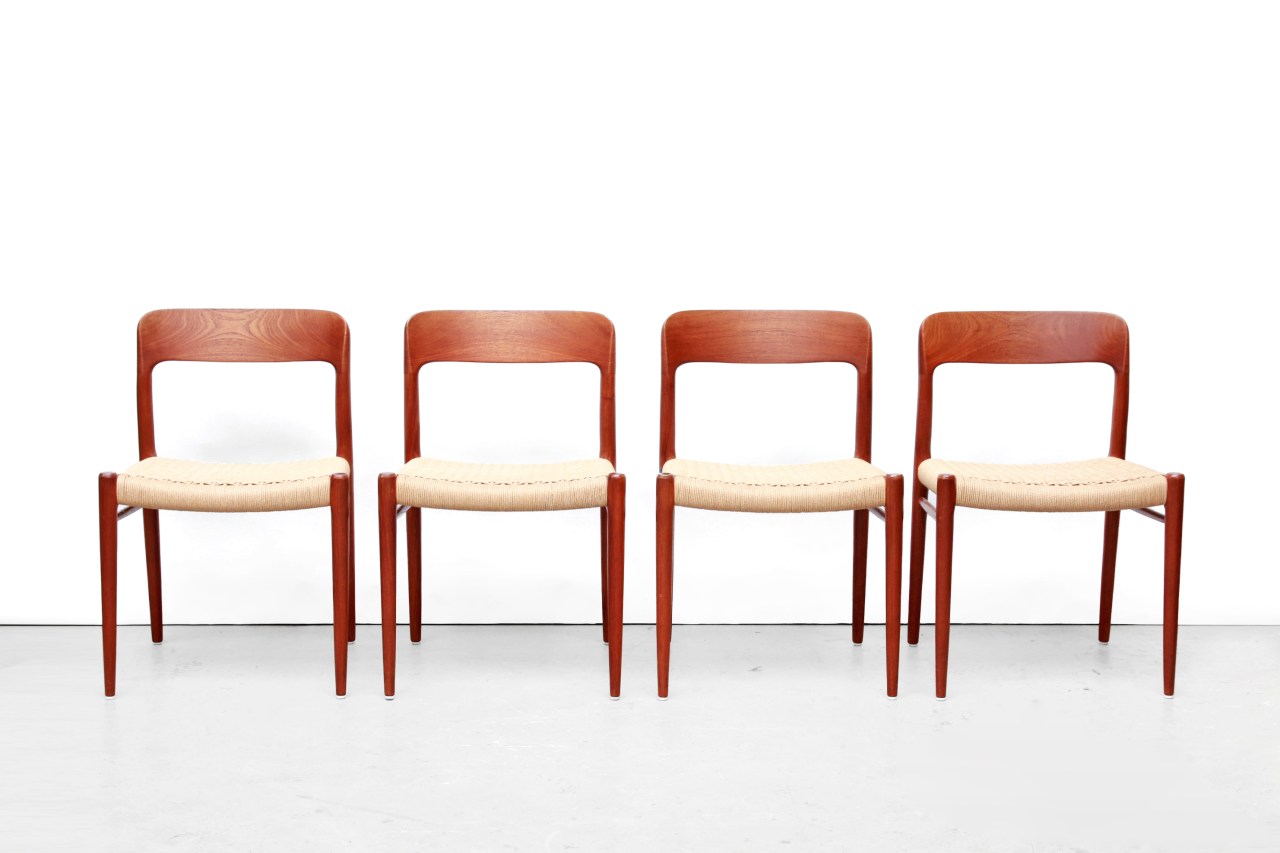 Omschrijving: Erg mooie set van vier eetkamer stoelen ontworpen door Niels Møller. Niels Møller staat in Denemarken bekend voor kwaliteit en vakmanschap en dat is ook goed te zien bij dit model, ‘model 75’. De stoelen zijn meer dan 50 jaar oud en verkeren nog in top staat. Het massief teakhouten frame is en zelfs de papercord zittingen zijn nog compleet origineel en in zo’n goede staat dat je bijna denkt dat ze nooit gebruikt zijn.