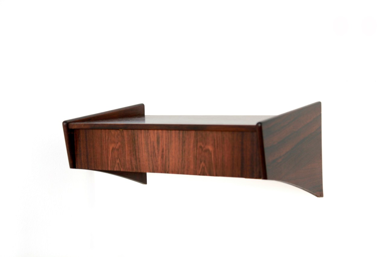 Omschrijving: Zeer mooi zwevend kastje uit Denemarken gemaakt van Palissander fineer. Het kastje word blind bevestigd aan de muur en heeft één lade. Het kastje is eigenlijk bedoeld als nachtkastje maar kan ook goed in de gang gehangen worden, bijvoorbeeld onder een spiegel. Het kastje is 39 cm breed, 24 cm diep en 17 cm hoog.