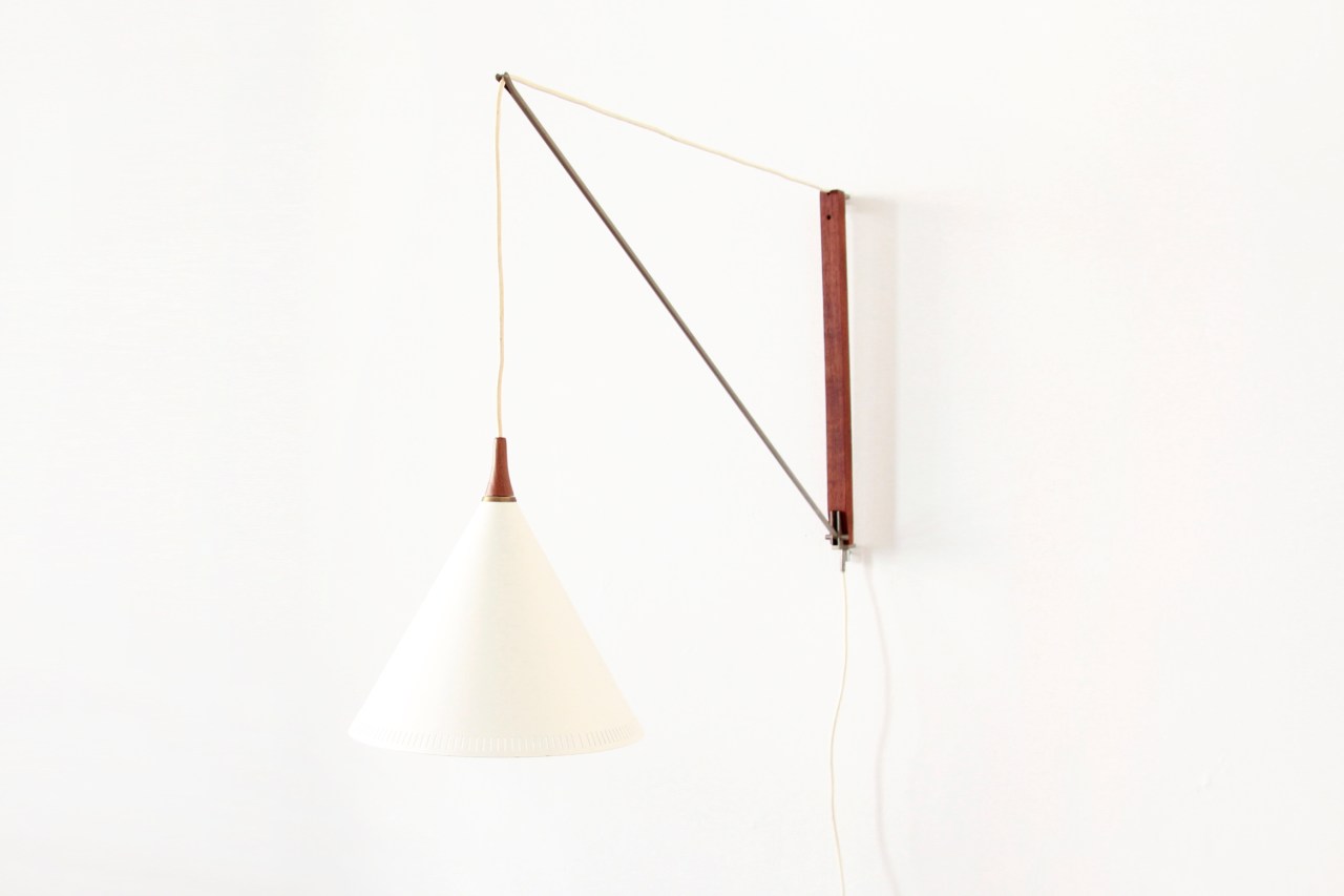 Omschrijving: Zeer mooie wandlamp ontworpen door Willem Hagoort in de jaren 50. De lamp is in hoogte verstelbaar door het ingenieuze en eenvoudige balanssysteem van de vernikkelde arm en de bedrading van de lamp. De lamp is in totaal 55 cm hoog, 110 cm diep en de kap heeft een diameter van 28 cm.