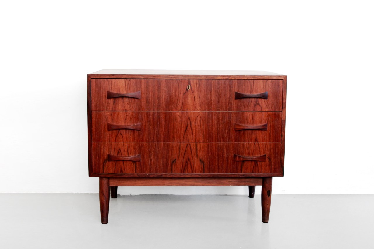 Omschrijving: Prachtige Deens design ladenkast met 3 lades. Uitgevoerd in Rio Palissander fineer en zeer mooi gevormde massief palissander houten greepjes. De kast heeft 3 grote en diepe lades die zorgen voor erg veel opbergmogelijkheid. Deze ladenkast is 84 cm breed, 42 cm diep en 66 cm hoog.
