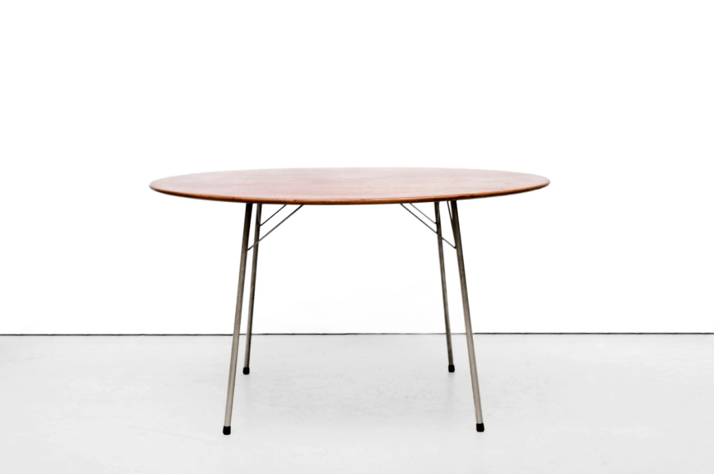 Omschrijving: Zeer mooie eetkamerset ontworpen door Arne Jacobsen en geproduceerd door Fritz Hansen in de jaren 50. We hebben deze set van de dochter van de eerste eigenaar gekocht, die hem eind jaren 50 heeft gekocht. De tafel is in het bezit van een oud stickertje en de stoelen hebben het metalen afdekplaatje. De ronde teak gefineerde tafel met model nummer 3600 zie je niet vaak, in combinatie met de teakhouten vlinderstoelen is dit een erg mooie set. De tafel heeft een diameter van 120 cm en is 68 cm hoog. De stoelen zijn in totaal 75 cm hoog en hebben een zithoogte van 43 cm.