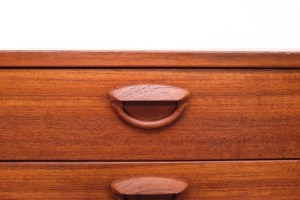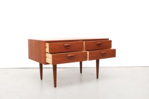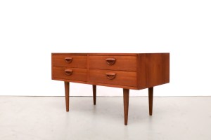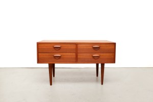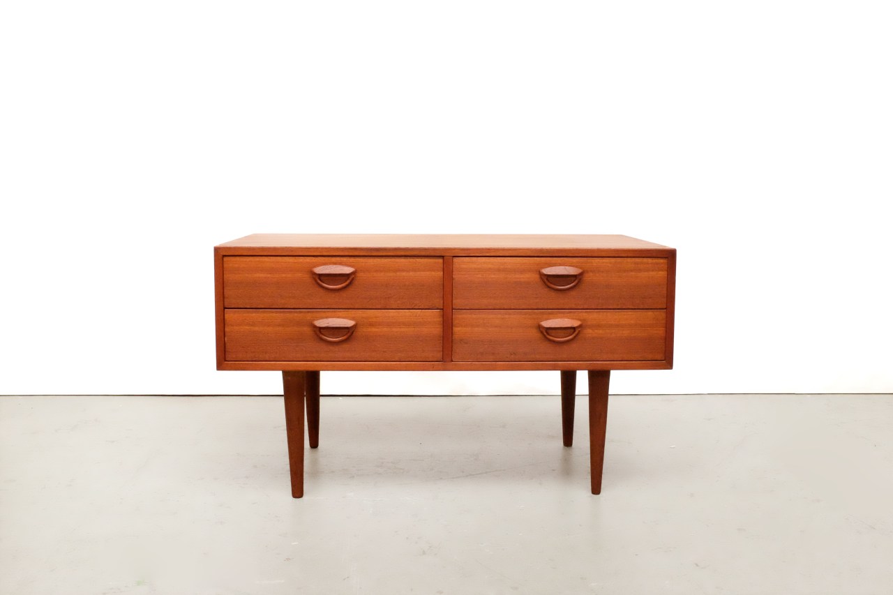 Omschrijving: Mooie teakhouten ladenkast uit het begin van de jaren 60, ontworpen door Kai Kristiansen uit Denemarken. Deze Deense ladenkast is gemaakt van teak fineer en staat op massief teakhouten conische pootjes. De massieve teakhouten handgreepjes van de lades hebben een prachtige vormgeving waar je vrolijk van wordt. De ladenkast is 85,5 cm breed, 49 cm hoog en 45 cm diep. Dit kastje is bijvoorbeeld zeer geschikt om de tv op te plaatsen.