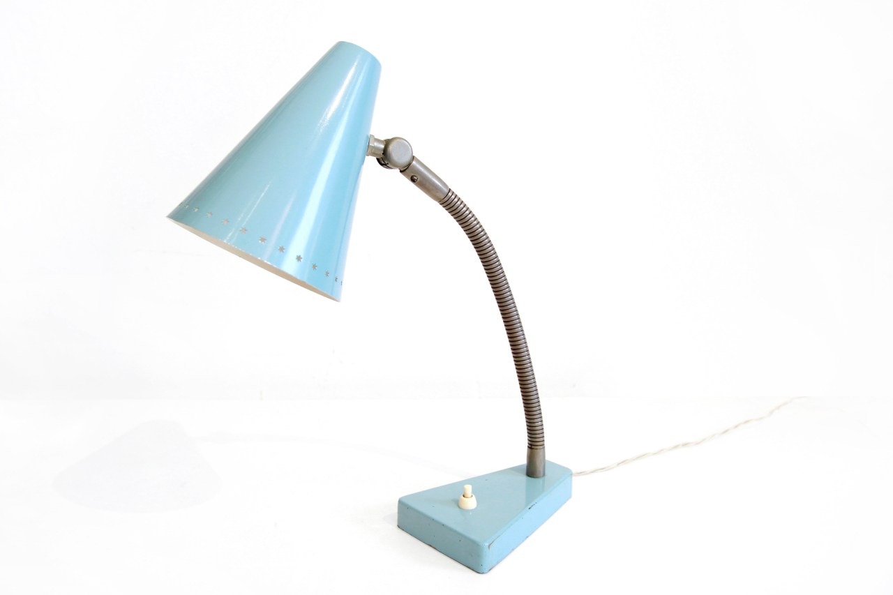 Omschrijving: Vintage tafel- of bureaulamp ontworpen door H. Busquet voor Hala Zeist. Deze Nederlandse design lamp heeft een blauwe kap met de iconische sterretjes en een buigzame chromen poot. Het lampje is daardoor verstelbaar, en dus in elke gewenste positie te zetten.