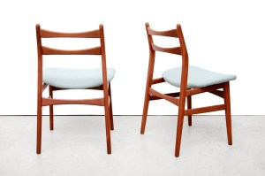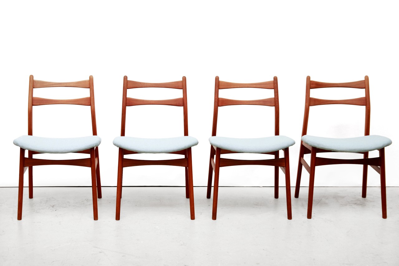 Omschrijving: Mooie set Deense eetkamer stoelen in de style van Erik Buch. De stoelen zijn gemaakt van massief teak hout en zijn bekleed in een frisse licht blauwe meubel stof. Het is een zeer stevige en kwalitatief goede set die ook nog eens kleur aan je interieur geeft.