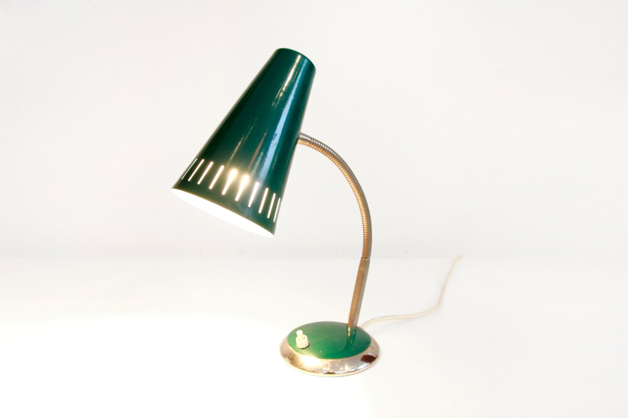 Omschrijving: Prachtige vintage tafel- of bureaulamp uit het midden van de vorige eeuw. Deze lamp heeft een geperforeerde donker groene kap welke zorgt voor een zeer mooi lichteffect zodra de lamp aanstaat. Het voetje is donker groen met chroom en is voorzien van een flexibele chromen poot, waardoor de lamp in elke gewenste positie te verstellen is.