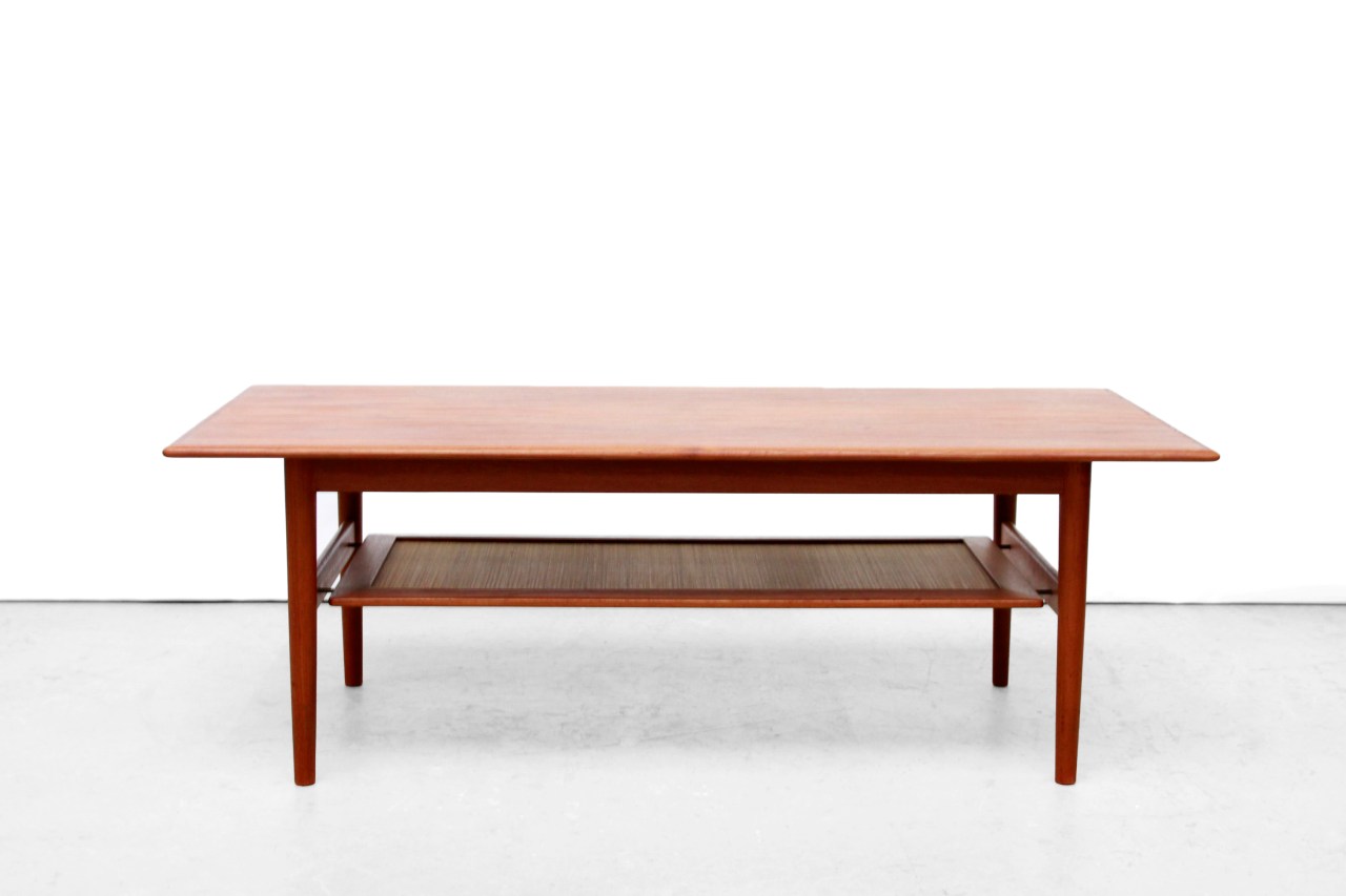 Omschrijving: Mooi simplistische Deense teak houten salon tafel van het bekende duo Peter Hvidt en Orla Mølgaard Nielsen voor France and Son. De salontafel is gemaakt van massief teak en teakfineer en heeft een met riet bekleed onderblad voor magazines. Deze salontafel is 120 cm breed, 52 cm diep en 42 cm hoog.