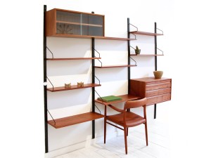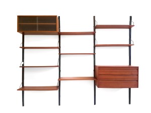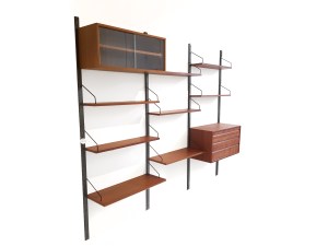 Omschrijving: Erg mooi en groot wandsysteem gemaakt van teak ontworpen door Poul Cadovius en geproduceerd door Royal System Denmark. Deze wandkast bestaat uit 4 houten staanders, 8 planken, een vitrinekast en een ladenkast. Het is niet alleen een prachtig object in huis, maar ook nog eens heel functioneel. De totale breedte van de kast zoals afgebeeld op de foto is 245 cm.