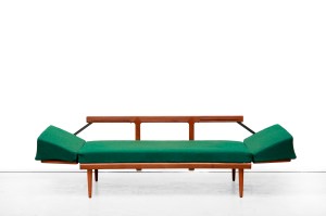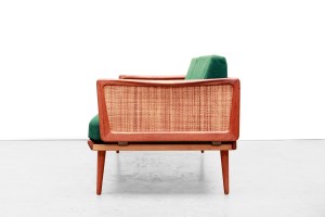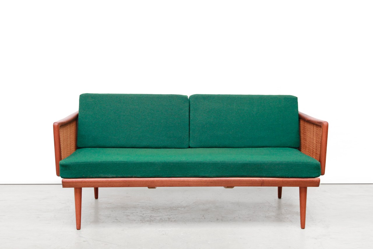 Omschrijving: Bijzonder mooie slaapbank van Peter Hvidt en Orla Molgaard. Het frame is gemaakt van massief teakhout en is van erg hoge kwaliteit. De bank is door heel slim systeem in nog geen minuut om te toveren tot een eenpersoons bed die ook nog eens heel erg lekker ligt. Deze sofa wordt zelden aangeboden en dit is daarom een unieke kans om een erg elegante designklassieker uit Denemarken in uw interieur te kunnen zetten. De bank is 160 cm breed, 80 cm diep en 77 cm hoog. De zithoogte van de bank is 42 cm.