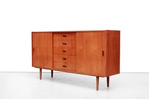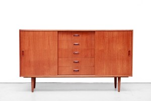 Omschrijving: Mooi teakhouten design dressoir uit Denemarken. Het dressoir is gemaakt van teakfineer en massief teakhout. Dit sideboard heeft twee schuif deurtjes en 5 lades die zorgen voor voldoende opbergruimte. Het dressoir is 150 cm breed, 39 cm diep and 85 cm hoog.
