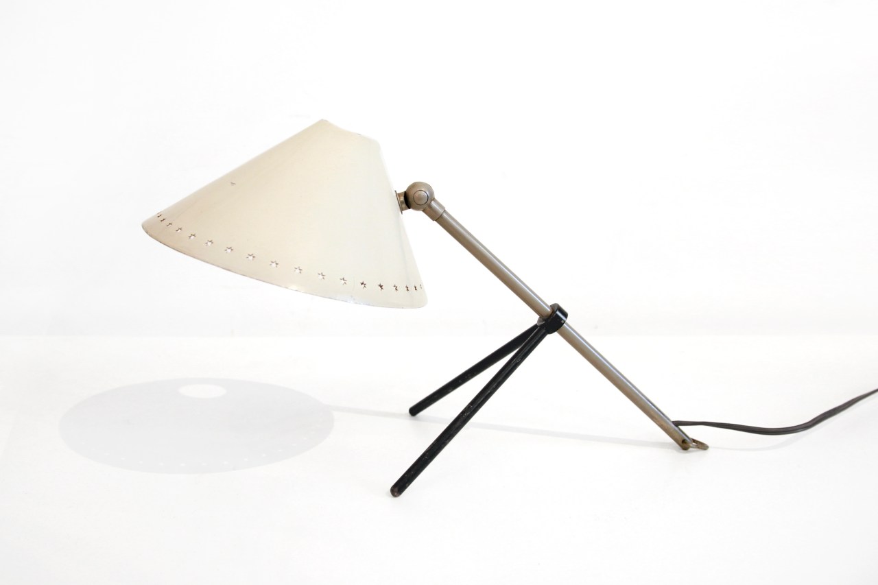 Omschrijving: Een iconisch tafel lampje van H. Busquet voor Hala. Dit lampje is ontworpen na zijn bekende zonneserie en was een groot succes. Het lampje kan in verschillende standen worden neergezet of opgehangen worden aan de muur. Hij is daarom geschikt als tafellamp maar bijvoorbeeld ook als bed lampje. Het lampje is 28 cm hoog, de diameter van de kap is 15 cm.