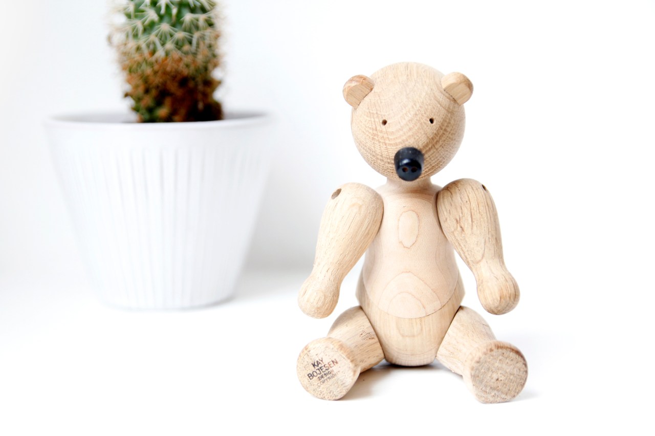 Omschrijving: Prachtig houten speelgoed dieren ontworpen door Kay Bojesen. Kay Bojesen geloofde dat producten voor kinderen “lekker in de hand” moesten liggen, en dat de ontwerpen mensen moesten laten lachen. Vanaf 1934 ontwierp Bojesen het walnoten houten hondje, in 1951 de iconische aap gemaakt van teak en limbahout, in 1952 de eikenhouten beer met esdoorn buikje, in 1953 de eikenhouten olifant, in 1955 het eikenhouten nijlpaard en in 1957 het eikenhouten konijn. Op het nijlpaard na hebben alle dieren roterende armen en benen die het mogelijk maken dat de dieren geanimeerde bewegingen kunnen maken. Het aapje kan met zijn handen en voeten ook heel speels overal aan gehaakt worden, waardoor deze net als in het echt overal aan kan hangen en klauteren. Deze houten figuren zijn zeer decoratief.