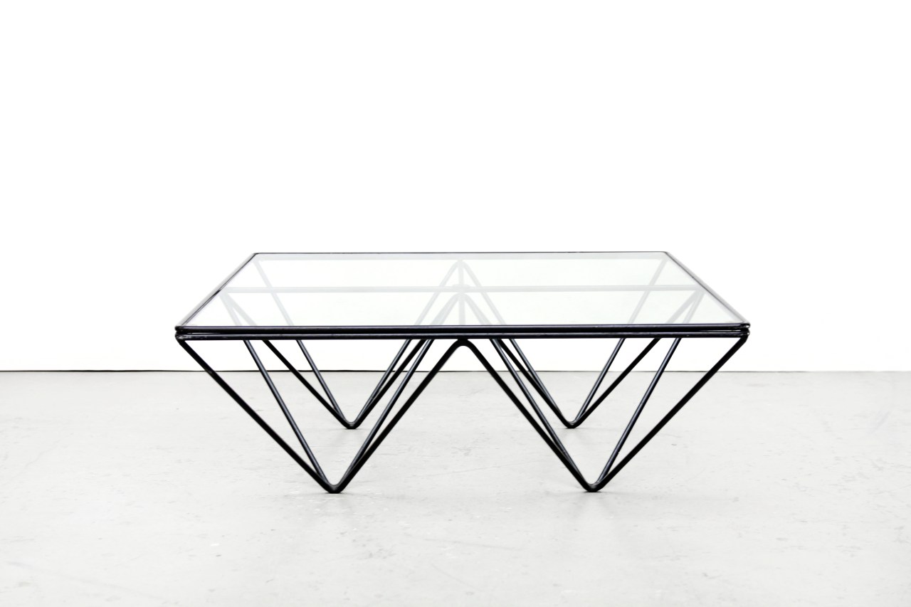 Omschrijving: Prachtige geometrische salontafel model Alanda van Paolo Piva. Het minimalistische ontwerp met het mooie lijnenspel van het zwart gelakte metalen frame en de doorzichtige glasplaat als blad is tijdloos. De tafel is 80 cm bij 80 cm en is 31 cm hoog.