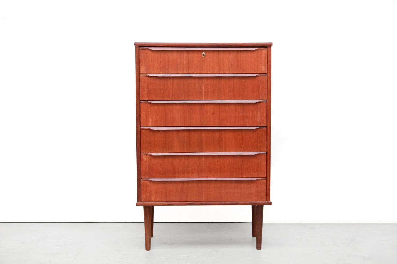 Omschrijving: Mooi en groot Deens design ladenkast met 6 lades. Uitgevoerd in teak fineer en massief teak houten greepjes en pootjes. Deze kast heeft een mooie subtiele tekening in het hout. Zo hoog zie je deze kasten niet vaak meer. Heerlijk formaat waar je veel in op kunt bergen. Deze kast kan ook goed gebruikt worden als commode. Deze ladenkast is 70 cm breed, 40 cm diep en 109 cm hoog.