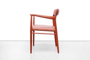 Omschrijving: Prachtige hoge fauteuil of comfortabele eetkamerstoel met armleuningen ontworpen door Niels Møller. Niels Møller staat in Denemarken bekend om kwaliteit en vakmanschap en dat is ook goed te zien bij dit model, ‘model 56’. Deze stoel is meer dan 50 jaar oud en verkeert nog in top staat. Volgens de eerste eigenaar van deze stoelen is de bruine skai bekleding ook nog volledig origineel. De stoel is in totaal 78 cm hoog, 58 cm breed en 55 cm diep. De stoel heeft een zithoogte van 44 cm.