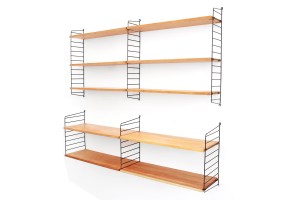 Omschrijving: Mooi String wandrek van Nisse Strinning. De planken zijn uitgevoerd in gefineerd grenen hout en zijn 78 cm breed. Deze set bestaat uit 3 normale staanders en drie diepe staanders, 6 planken van 20 cm diep en 4 planken van 30 cm diep. Op de foto staat het rekje als een geheel afgebeeld. Het rek zou ook als twee losse rekken opgehangen kunnen worden. Bijvoorbeeld in verschillende ruimtes. Zoals op de foto afgebeeld is het rek 158 cm breed.