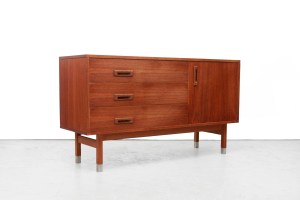 Omschrijving: Mooi design dressoir uitgevoerd in teak op houten pootjes met verchroomde dopjes. Het dressoir heeft drie lades en een deurtje, waarachter een plank verscholen is. De greepjes zijn gemaakt van eiken hout. Dit dressoir is helaas niet gemerkt, maar door de rechte modernistische vormgeving en de berkenhouten binnenkant doet het ons vermoeden dat het dressoir van Nederlandse afkomst is. Het dressoir is 135 cm breed, 42 cm diep en 75 cm hoog.