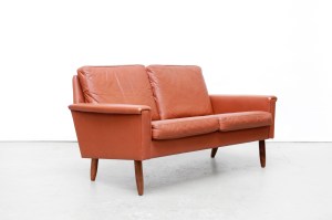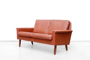 Omschrijving: Klein maar fijne bruin leren Deens design bank uit Denemarken. Deze tweezitter is uitgevoerd in bruin leer met conische houten pootjes met prachtige tekening. De bank heeft een zeer mooie mid century modernistische uitstraling welke als kenmerk heeft dat hij optisch niet veel ruimte inneemt. Deze comfortabele bank is 132 cm breed, 70 cm diep en 70 cm hoog. De zithoogte is 40 cm.