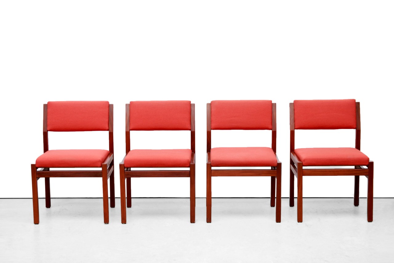 Omschrijving Vier mooie teakhouten Pastoe eetkamer stoelen uit de Japanse serie ontworpen door Cees Braakman in de jaren 60. Deze vier stoelen hebben een massief houten frame, en een nog originele rode wollen bekleding van de Ploeg op de zitting en rugleuning. De stoelen zijn in totaal 77 cm hoog, 50 cm breed, 50 cm diep en hebben een zithoogte van 45 cm.