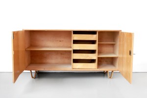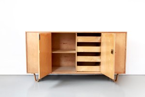 Omschrijving: Prachtig minimalistisch en stijlvol dressoir van Cees Braakman voor Pastoe. Dit dressoir heeft de naam DB02 en is gemaakt van Berken. Dit sideboard komt uit de bekende Berkenserie van Pastoe die gekenmerkt wordt door de iconische plywood luspoten en de gebogen anti-dust-lades. Dit dressoir heeft twee harmonicadeuren met daarachter vier anti-dust lades en drie planken. Dit sideboard is 154 cm breed, 80 cm hoog en 47,5 cm diep en is in het bezit van de originele PasToe sleutel.