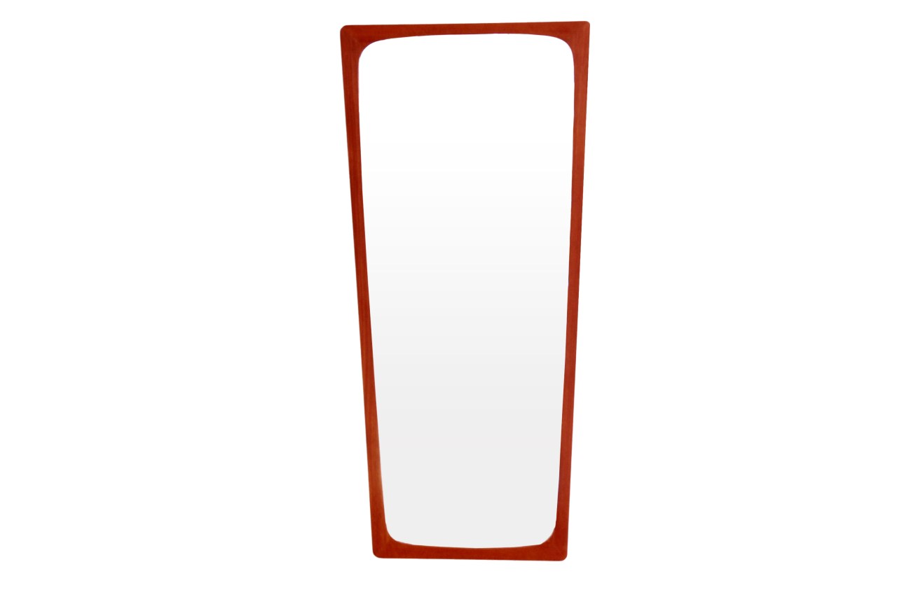 Omschrijving: Mooie Deens design spiegel gemaakt van massief teakhout. Deze spiegel heeft een bijzonder vormgeving waarbij de bovenkant breder is dan de onderkant. Door de lengte van de spiegel is deze uiterst geschikt om te gebruiken als passpiegel, of gebruik hem in de gang. Deze spiegel is 94 cm hoog en bovenaan 44 cm en onderaan 35 cm breed.