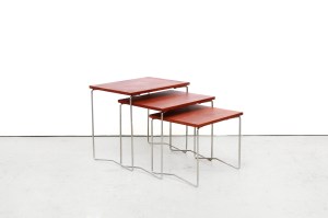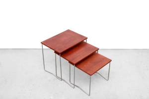Omschrijving: Een stijlvolle vintage mimiset gemaakt door de Nederlandse fabrikant Brabantia. Zet ze onder elkaar geschoven neer als bijzettafel zodat ze niet al te veel ruimte innemen, en pak er eentje onder vandaan als er op een andere plek een tafeltje nodig is. Of zet je juist als een groepje neer als bijvoorbeeld salontafel. Door de dunne teakhouten bladen en de chromen onderstellen is het een prachtig minimalistisch objecten voor in huis. Deze ranke bijzet tafeltjes zijn ongemerkt. Het grootste tafeltje is 38 cm hoog, 43 cm breed en 30 cm diep.