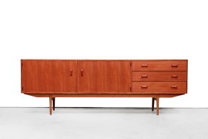 Omschrijving: Slank en lang dressoir in teakhout bestaande uit drie lades en twee deuren met daarachter een plank. Ronde slanke conische pootjes en massief teak houten greepjes met een prachtige vormgeving. Dit dressoir voelt ontzettend Scandinavisch aan, maar is van Nederlandse bodem. Hij is namelijk gemaakt door Fristho uit Franeker. Hij is ook gemerkt. Bijzonder aan dit dressoir is de lengte van wel 225 cm. Verder is deze kast 76 cm hoog en 43,5 cm diep.