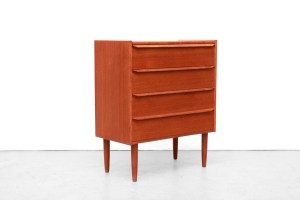 Omschrijving: Mooie Deens design ladekast met 4 lades. Uitgevoerd in teak fineer en massief teakhouten greepjes en pootjes. De vormgeving van het kastje is lekker modernistisch, recht en zonder poespas. Dit maakt het kastje gemaakt van kostbaar teakhout een tijdloos model. Heerlijk formaat waar je veel in op kunt bergen. Deze kast is 62 cm breed, 31 cm diep en 73 cm hoog.