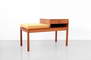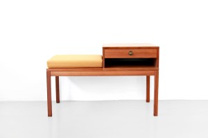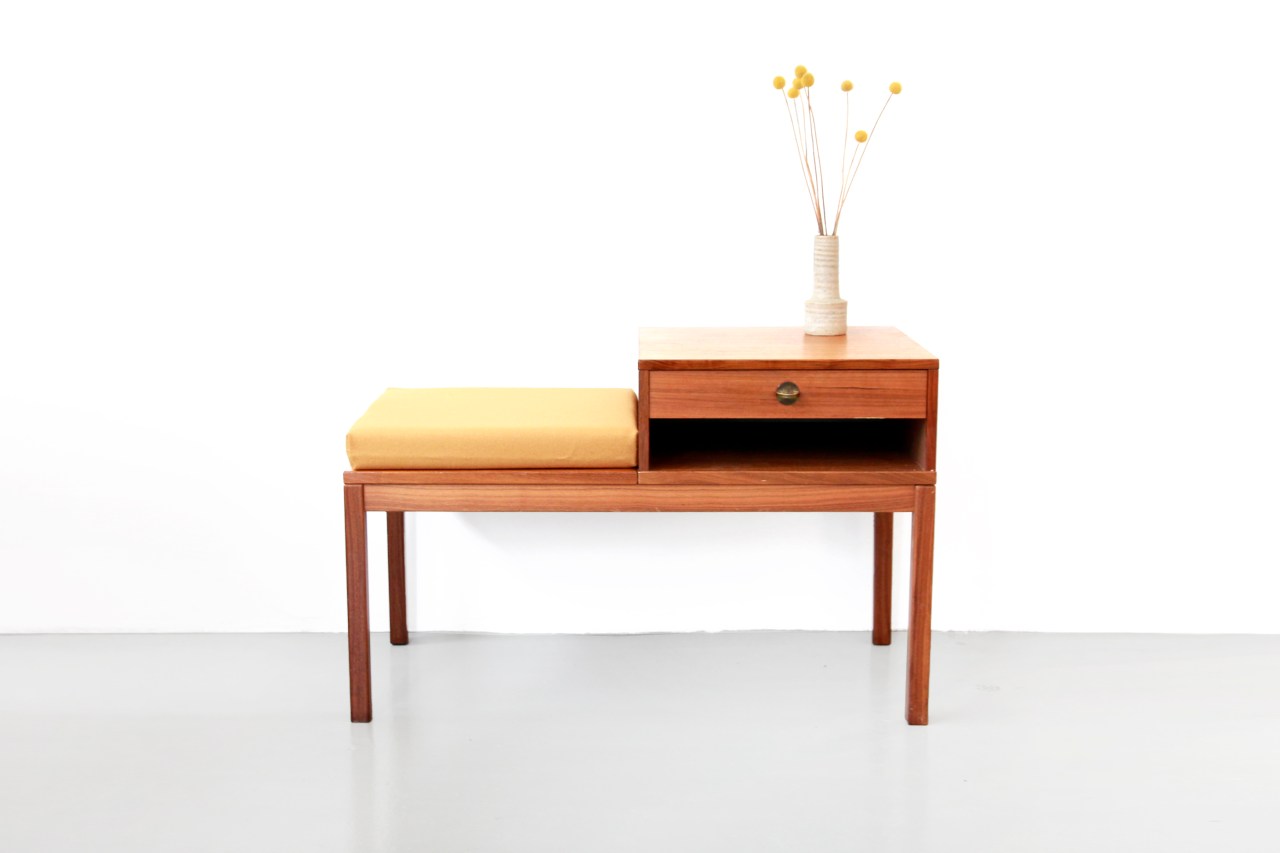Omschrijving: Super leuk tafeltje, kastje en bankje ineen. Dit tafeltje is van origine een telefoontafeltje van waar je met de vaste telefoon er even lekker voor ging zitten om met je familie of vrienden te bellen. Het wordt daarom ook wel eens roddeltafeltje, telefoonstoel of telefoontafel genoemd. Nu kan je dit leuke setje gebruiken voor in de gang als je je schoenen aan gaat doen, of neem het kussentje weg en gebruik hem als een dressoirtje voor je stereo of televisie. Dit kastje is multifunctioneel, zoals we wel gewend zijn van de meubels uit de jaren 60. Dit meubelstuk is voorzien van een nieuw kussentje met gele wollen Kvadrat Divina bekleding en is 90 cm breed, 57 cm hoog en 45 cm diep.