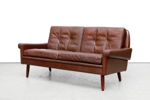 Omschrijving: Vintage leren sofa uit Denemarken ontworpen en gemaakt door Svend Skipper. De bank is bekleed met donker bruin leer en heeft slanke teak houten pootjes. De kussens zijn gecapitonneerd. De bank is geschikt voor ruim 2 en krap 3 personen. De bank heeft een zeer mooie mid century modernistische uitstraling welke als kenmerk heeft dat hij optisch niet veel ruimte inneemt. Het bankje is 145 cm breed, 72 cm hoog, 77 cm diep en heeft een zithoogte van 43 cm.