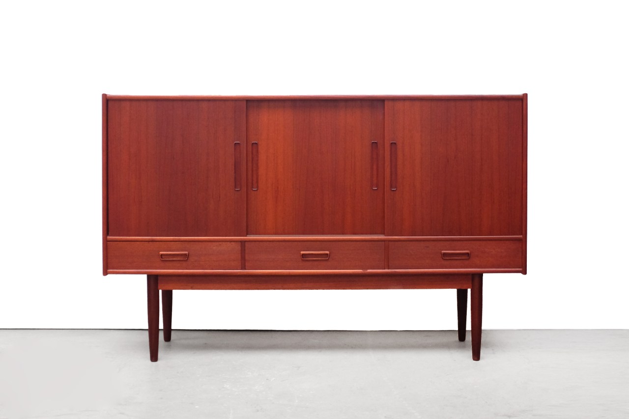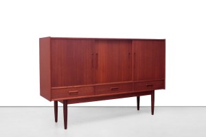 Omschrijving: Zeer mooie teakhouten Deens design highboard. Gemaakt van een combinatie van massief teakhout en teak fineer. De kast heeft drie schuifdeuren met achter de eerste twee deuren, twee planken, en achter de laatste deur: een plank, een lade en een spiegel. Onder de schuifdeuren heeft deze kast nog 3 lades. De kast is aan de achterkant gemerkt met SKAB nr 102. Dit Deens design cabinet is net even wat anders dan wat we gewend zijn van de organische Deense kasten, dit model is heel minimalistisch en recht. Hierdoor doet de kast ontzettend modern aan, en dit terwijl hij toch al zeker 50 jaar oud is. Deze kast is 175 cm breed, 112 cm hoog en 44 cm diep.