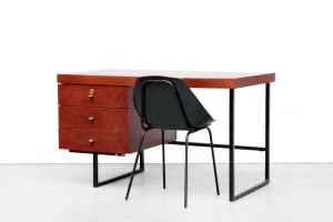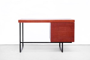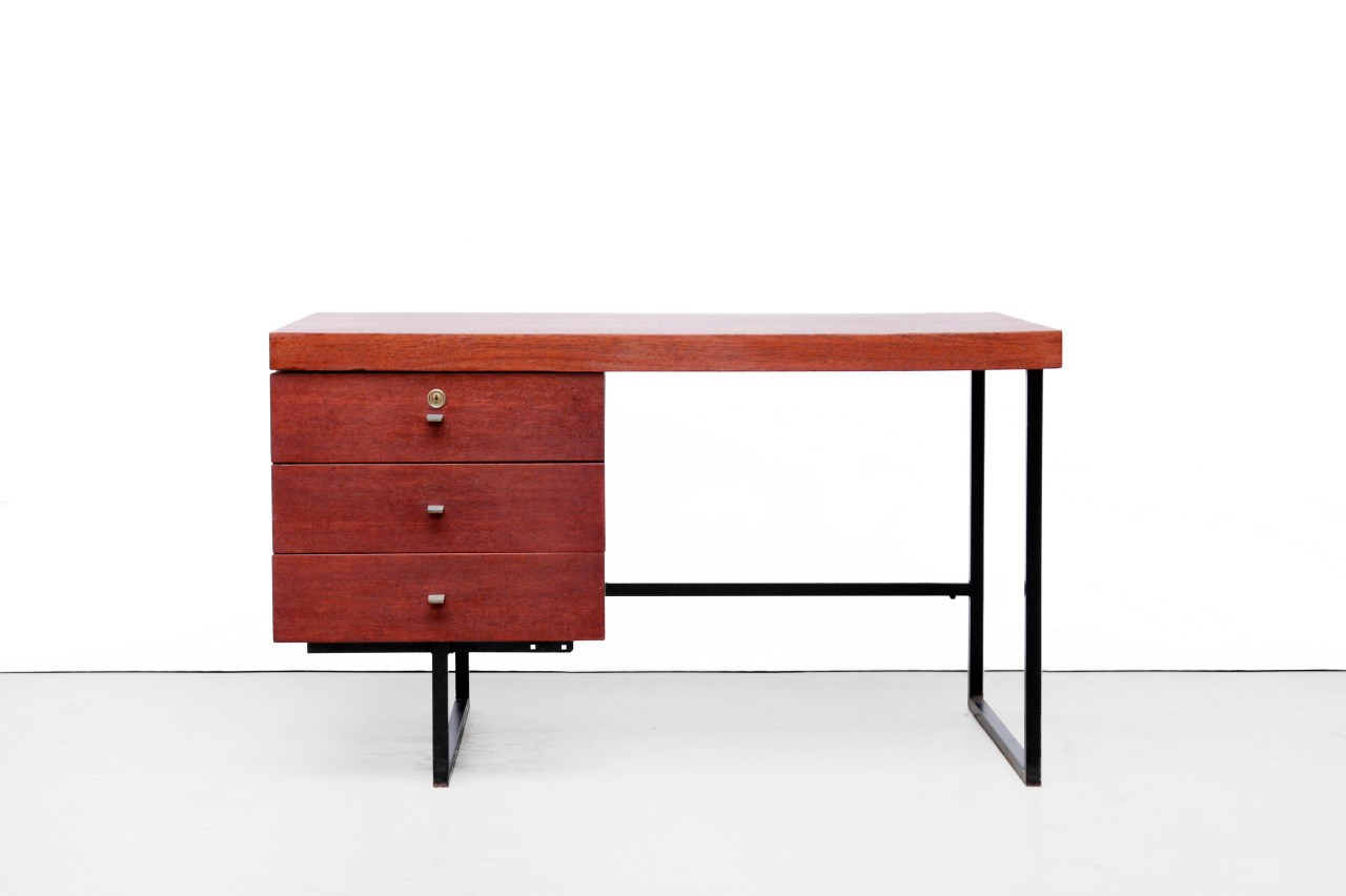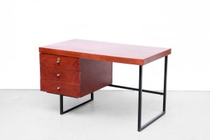 Omschrijving: Bijzonder mooi bureau van de Franse ontwerper Pierre Guariche voor Meurop. Gemaakt van teakhout en zwart gelakt metaal. Groot dik werkblad en drie ruime lades voor genoeg opbergruimte. Een degelijk en elegant meubel in één. Dit bureau is 125 x 70,5 x 73 cm. Mooi als set met de Pierre Guariche ‘coquillage’ stoel.