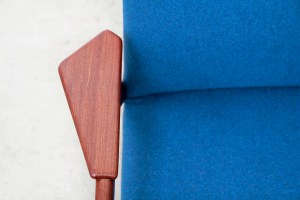 Deze elegante fauteuils zijn opnieuw gestoffeerd met een turquoise wollen meubelstof met vilt look en het teak houten frame met schitterende driehoekige armleuningen zijn goed schoongemaakt en voorzien van een nieuwe laag olie.