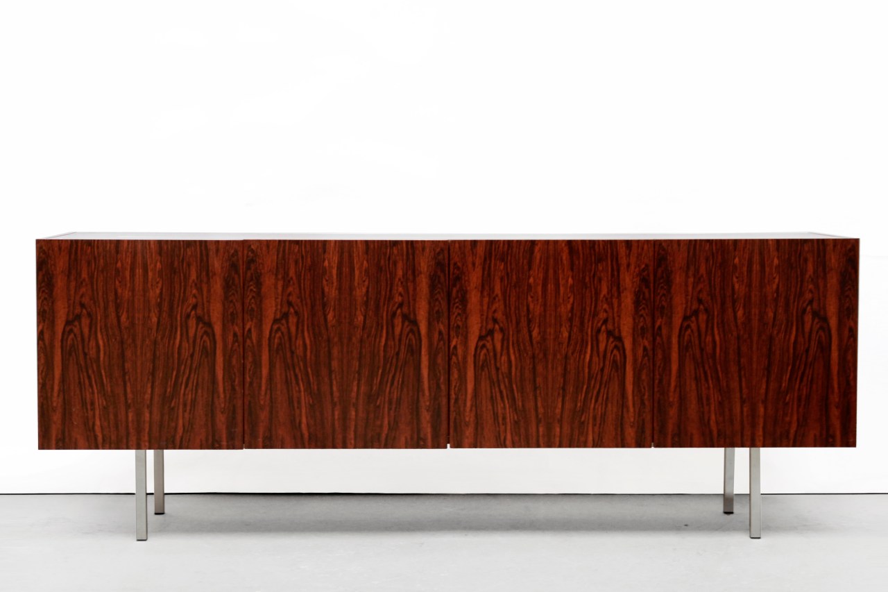 Omschrijving: Mooi strak en groot dressoir van palissanderhout met chromen poten. Achter de vier greeplozen deuren zitten twee planken en bied een hoop opbergruimte. Een mooie eyecatcher voor elk interieur! Dit dressoir is 199 x 48 x 75 cm.