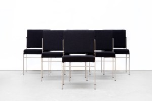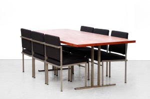 Omschrijving: Bijzondere en zeldzame eetkamer set ontworpen door Nederlandse ontwerper Rob Parry geproduceerd door Stabin-Bennis uit Woerden. Rob Parry en fabrikant Stabin-Bennis staan bekend staan om hun industriële vormgeving vervaardigd in metaal. Iets wat de vernieuwende modernistische stroming uit Nederland kenmerkt uit deze periode. Deze modernistische set bestaat uit 6 model Parlez eetkamerstoelen en een grote teak gefineerde tafel op een metalen onderstel. De tafel is 175 cm lang, 100 cm breed en 75 cm hoog. De stoelen hebben een zithoogte van 46 cm. De stoelen zijn opnieuw gestoffeerd met een zwarte wollen meubelstof en het tafelblad is gerestaureerd en daardoor weer in zeer goede staat. De set voelt heel erg tijdloos aan, terwijl deze toch al bijna 60 jaar oud is.