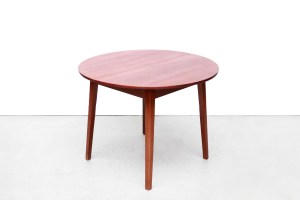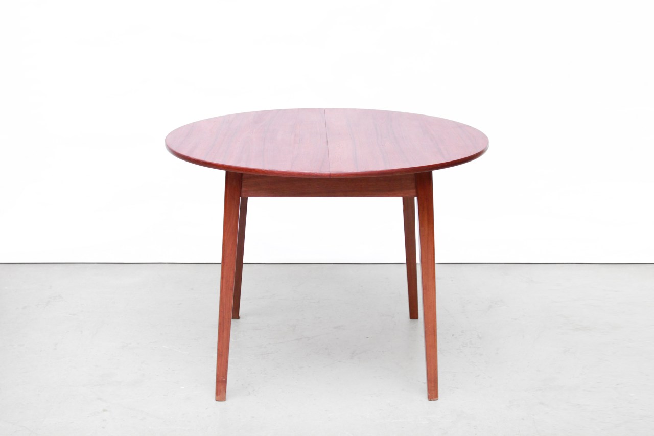 Omschrijving: Mooie vintage ronde teakhouten eetkamertafel. De tafel is uitschuifbaar en heeft een extra blad die ertussen geschoven kan worden. Zo is er ineens ruimte voor twee eters meer. De tafel is 77 cm hoog en heeft een diameter van 105 cm. Uitgeschoven is hij 145 cm.