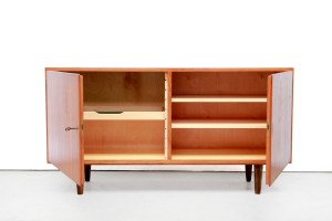 Het dressoir is gemaakt van teak fineer met een prachtige tekening in het hout. De kast heeft twee deuren met achter elke deur een plank. Het dressoir is gemerkt en is 138 cm breed, 73 cm hoog en 43 cm diep.