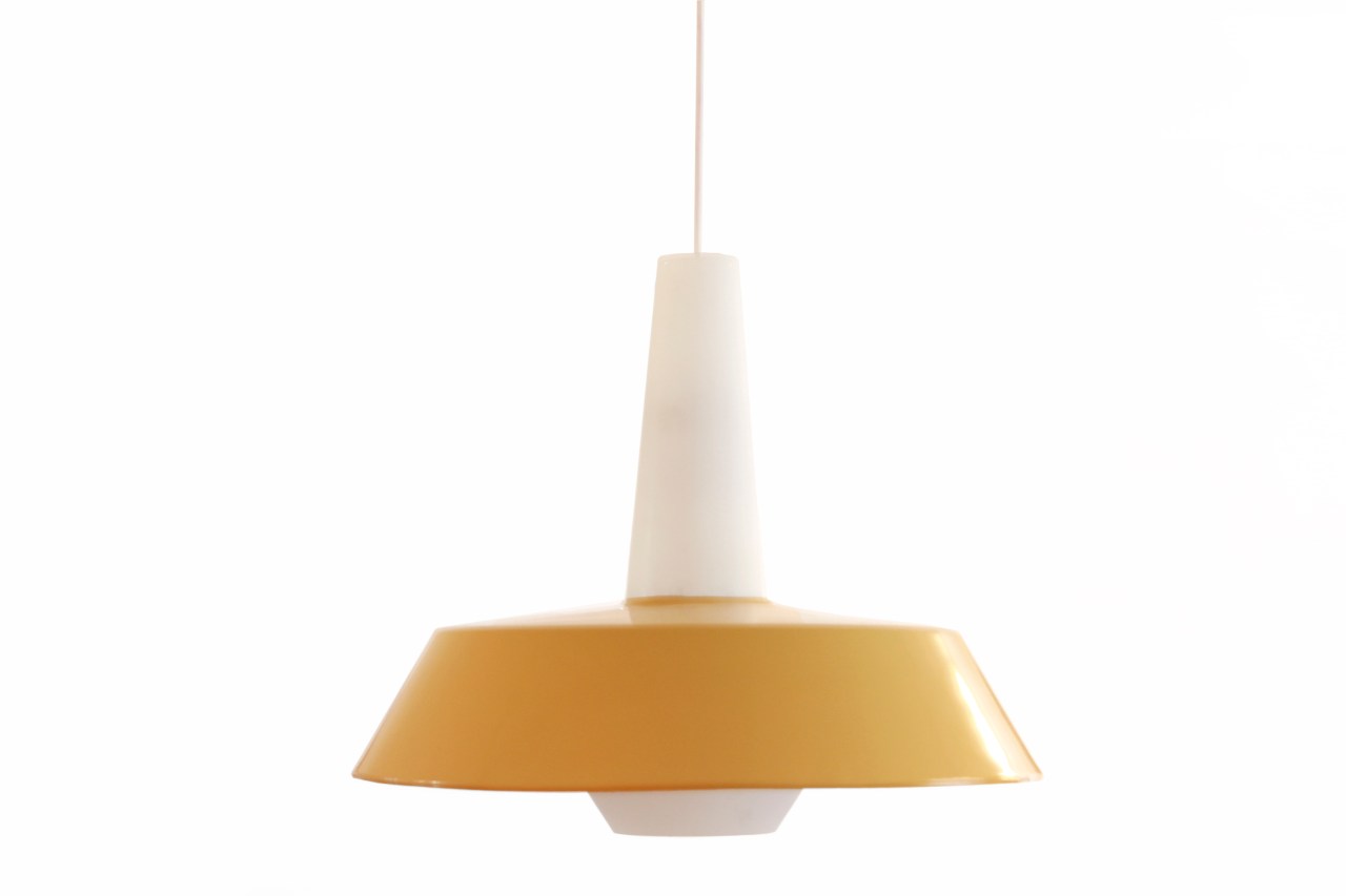 Omschrijving: Grote vintage hanglamp van Louis Kalff voor Philips. Deze lamp heeft een opaline glazen kelk met een grote geel gelakte metalen ring. Gemerkt met een Philips sticker.