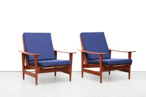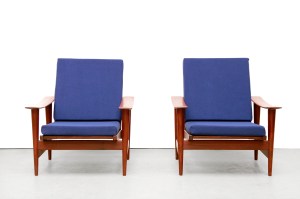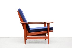 Omschrijving: Mooie teakhouten fauteuil met brede armleuningen en opnieuw gestoffeerde donker blauwe kussens. De fauteuils zijn afkomstig uit Scandinavië en vermoedelijk uit Denemarken. Helaas is de ontwerper ons onbekend. De fauteuils zijn 72 cm breed, 78 cm hoog en 75 cm diep. De zithoogte is 37 cm. Bij voorkeur worden de twee fauteuils als complete set verkocht.