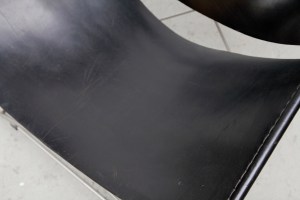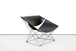 Omschrijving: Deze minimalistische zwart leren fauteuil is ontworpen door de Franse topdesigner Pierre Paulin voor Artifort in 1963. Deze stoel, type F675, is beter bekend als de vlinderstoel oftewel Butterfly, van Pierre Paulin. Dit model is een originele vroege editie met minimale sporen van leeftijd en gebruik en is nog in het bezit van de originele voetjes. Dit oude model wordt steeds moeilijker te vinden met het oude vernikkelde frame en met het originele zwarte leer. De hoogte is in totaal 64 cm, hij is 82 cm breed en 67 cm diep. Deze fauteuil ziet er geweldig uit in elk modern design interieur.