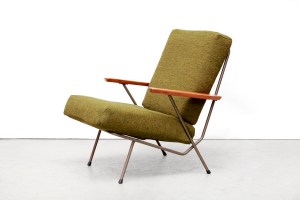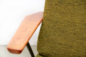 Omschrijving: Deze Dutch design fauteuil is ontworpen door Koene Oberman voor Gelderland, Nederland rondom 1954. Dit minimalistische ontwerp met metalen frame, houten armleuningen en groen gestoffeerde springveren kussens is een originele vroege vintage editie met minimale sporen van leeftijd en gebruik. De kussens zijn bekleed met de originele stoffering. Desgewenst kan de stoel tegen bijbetaling opnieuw gestoffeerd worden.