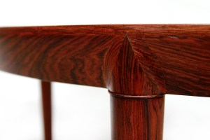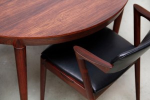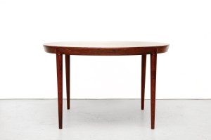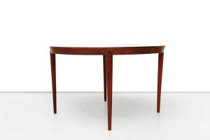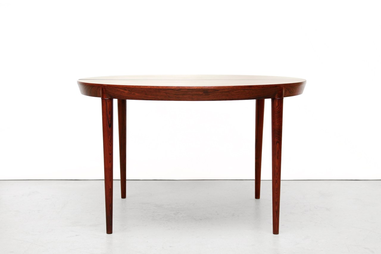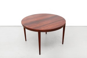 Omschrijving: Deens design eetkamertafel ontworpen door Severin Hansen en geproduceerd door Haslev Mobelfabrik in Denemarken. Prachtig gemaakt met oog voor detail. Uitgevoerd in palissander fineer en massief palissander ronde poten met Severin Hansens kenmerkende driehoekige verbinding. Het tafelblad heeft een afgeschuinde rand die naadloos aansluit op elke tafelpoot en is niet verlengbaar. De tafel heeft een diameter van 118 cm en is 72 cm hoog.